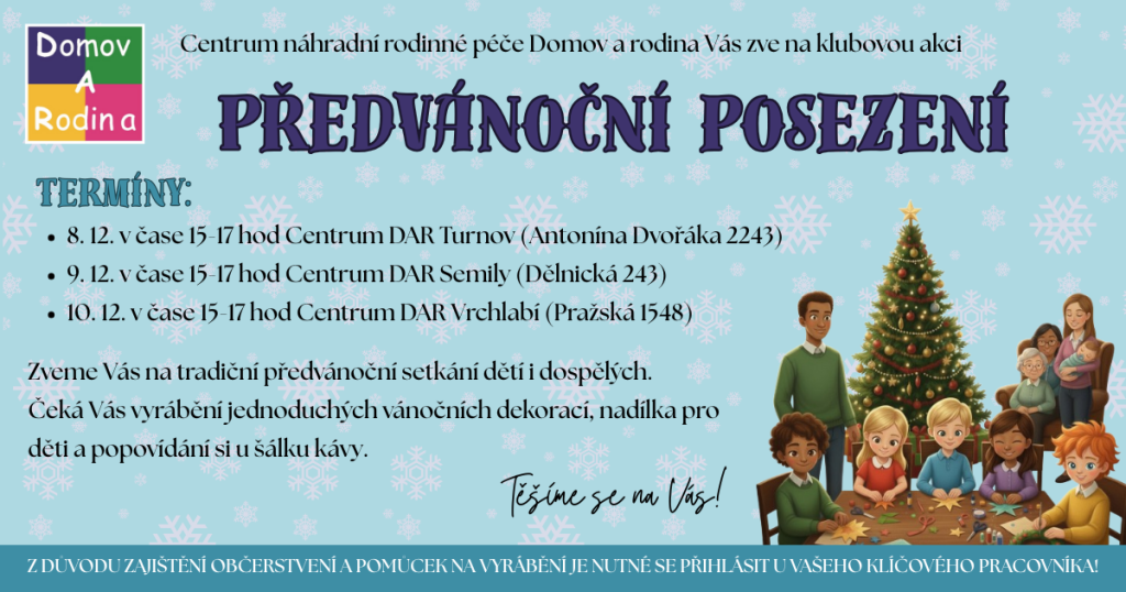 Setkání pěstounů, dětí a pracovníků, sdílení zkušeností, výroba pomlázek a dalších jarních dekorací (proutky budou na místě, ale tentokrát neslibujeme, že vystačí pro všechny). Posezení s občerstvením. 7.4.2025 od 15:00h. Centrum DAR Vrchlabí (Pražská 1548) 16.4.2025 od 15:00h. Centrum DAR Semily (Dělnická 243) 17.4.2025 od 15:00h. Centrum DAR Turnov (Antonína Dvořáka 2243) - Letní pobyt pro děti ve věku 8 – 18 let